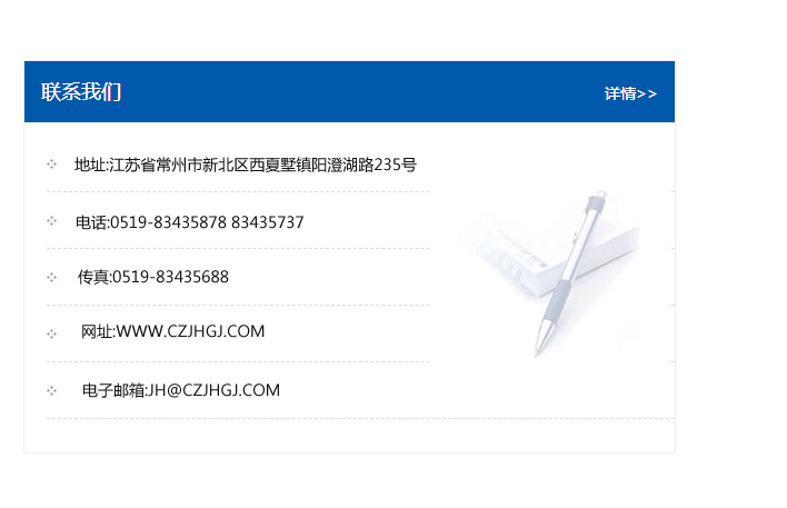地址:常州市新北區友邦商務大廈1幢16、17層  電話:0519-85101652  傳真:0519-85112595  郵編:213022  網址:www_cz-jiayue_cn.digaules.com  郵箱:xiajifengaa@163.com